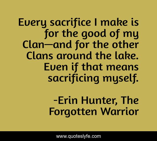 This page presents the quote "Every sacrifice I make is for the good of my Clan—and for the other Clans around the lake. Even if that means sacrificing myself.". Author of this quote is Erin Hunter, The Forgotten Warrior. This quote is about warriors, cats, ivypool,.