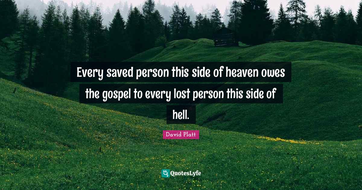 This page presents the quote "Every saved person this side of heaven owes the gospel to every lost person this side of hell.". Author of this quote is David Platt. This quote is about lost, saved, sides, heaven, hell,.