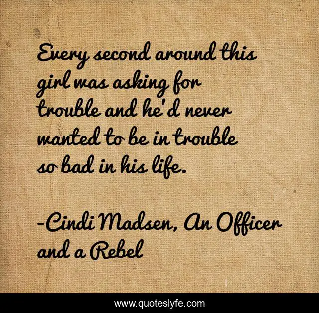 This page presents the quote "Every second around this girl was asking for trouble and he'd never wanted to be in trouble so bad in his life.". Author of this quote is Cindi Madsen, An Officer and a Rebel. This quote is about holiday-romance, christmas-romance, contemporary-romance,.