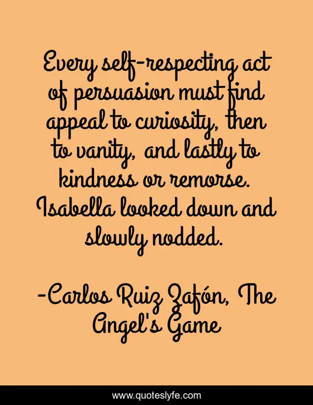 This page presents the quote "Every self-respecting act of persuasion must find appeal to curiosity, then to vanity, and lastly to kindness or remorse. Isabella looked down and slowly nodded.". Author of this quote is Carlos Ruiz Zafón, The Angel's Game. This quote is about kindness, remorse, persuasion, curiosity, vanity,.