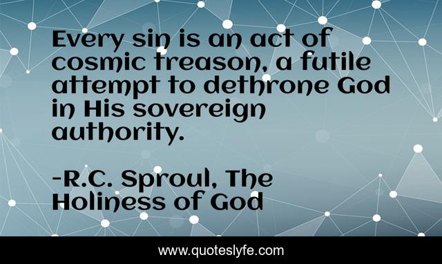 This page presents the quote "Every sin is an act of cosmic treason, a futile attempt to dethrone God in His sovereign authority.". Author of this quote is R.C. Sproul, The Holiness of God. This quote is about cosmic-ordering, attempt, sovereignty-of-god, cosmic, authority, jack-goldenberg, treason,.
