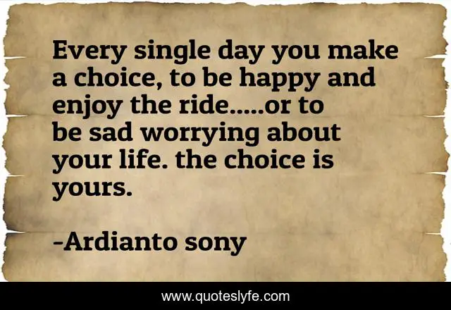 This page presents the quote "Every single day you make a choice, to be happy and enjoy the ride.....or to be sad worrying about your life. the choice is yours.". Author of this quote is Ardianto sony. .