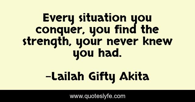 This page presents the quote "Every situation you conquer, you find the strength, your never knew you had.". Author of this quote is Lailah Gifty Akita. This quote is about self-motivation, strength, conquer, adversity,.