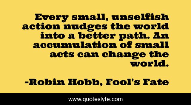 "Robin Hobb, Fool's Fate Quotes." Quoteslyfe.com, 2025. Fri. 05 Dec. 2025. <https://www.quoteslyfe.com/quote/Every-small-unselfish-action-nudges-the-world-136620>.