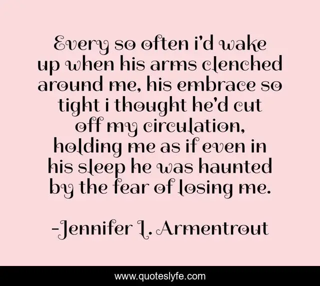 This page presents the quote "Every so often i'd wake up when his arms clenched around me, his embrace so tight i thought he'd cut off my circulation, holding me as if even in his sleep he was haunted by the fear of losing me.". Author of this quote is Jennifer L. Armentrout. .