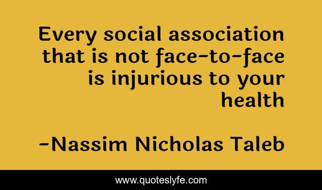 This page presents the quote "Every social association that is not face-to-face is injurious to your health". Author of this quote is Nassim Nicholas Taleb. This quote is about modernity-is-a-sickness, technology-enchantment, internet-addiction, technology-addiction, internet, technology,.