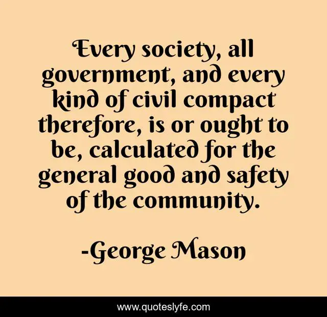 This page presents the quote "Every society, all government, and every kind of civil compact therefore, is or ought to be, calculated for the general good and safety of the community.". Author of this quote is George Mason. This quote is about safety, community,.