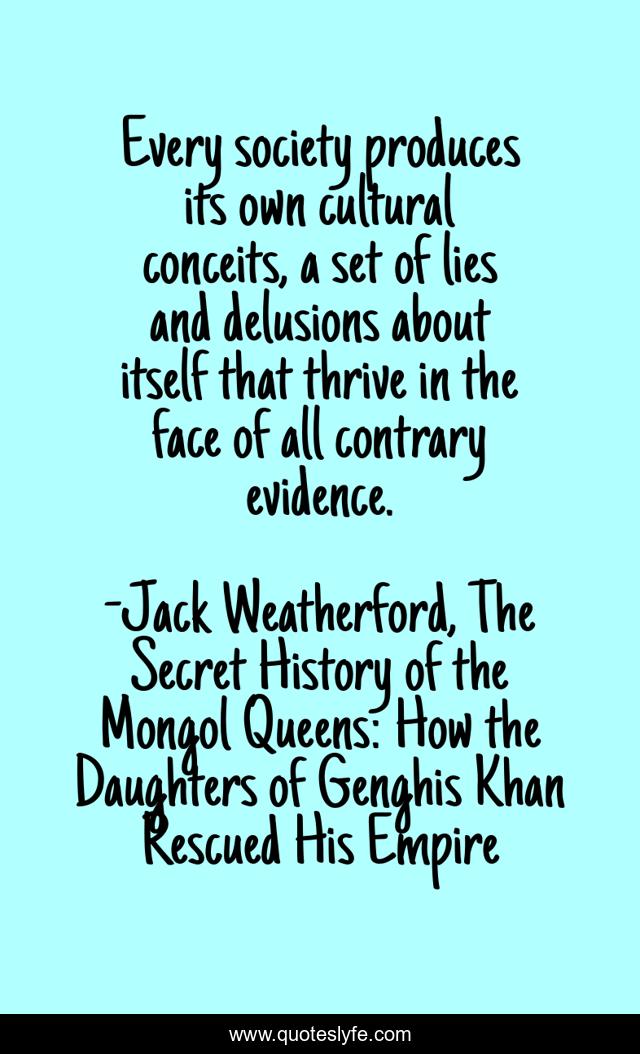 "Jack Weatherford, The Secret History of the Mongol Queens: How the Daughters of Genghis Khan Rescued His Empire Quotes." Quoteslyfe.com, 2026. Tue. 13 Jan. 2026. <https://www.quoteslyfe.com/quote/Every-society-produces-its-own-cultural-conceits-102754>.