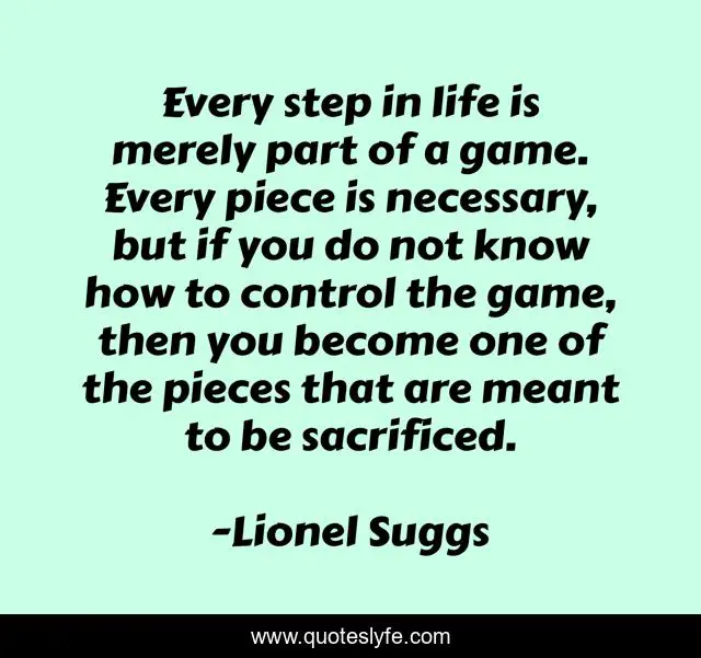 This page presents the quote "Every step in life is merely part of a game. Every piece is necessary, but if you do not know how to control the game, then you become one of the pieces that are meant to be sacrificed.". Author of this quote is Lionel Suggs. This quote is about games, philosophy, tactics, life-lessons, strategy,.