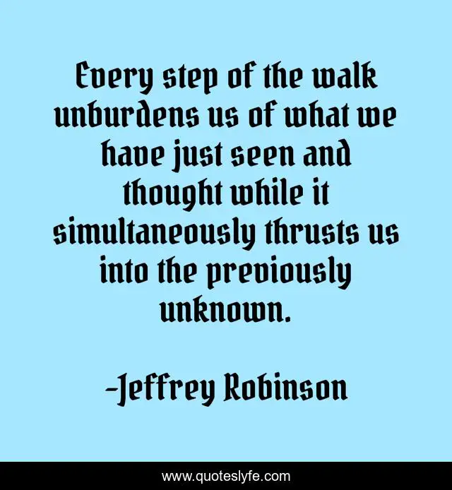 This page presents the quote "Every step of the walk unburdens us of what we have just seen and thought while it simultaneously thrusts us into the previously unknown.". Author of this quote is Jeffrey Robinson. This quote is about walking, nature, outdoors,.
