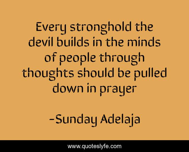 This page presents the quote "Every stronghold the devil builds in the minds of people through thoughts should be pulled down in prayer". Author of this quote is Sunday Adelaja. This quote is about strongholds, prayer,.