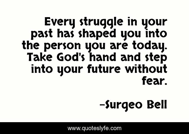 This page presents the quote "Every struggle in your past has shaped you into the person you are today. Take God's hand and step into your future without fear.". Author of this quote is Surgeo Bell. This quote is about today-is-your-day, future-plans, fearless, struggles, past, future, better-self, god, fear,.