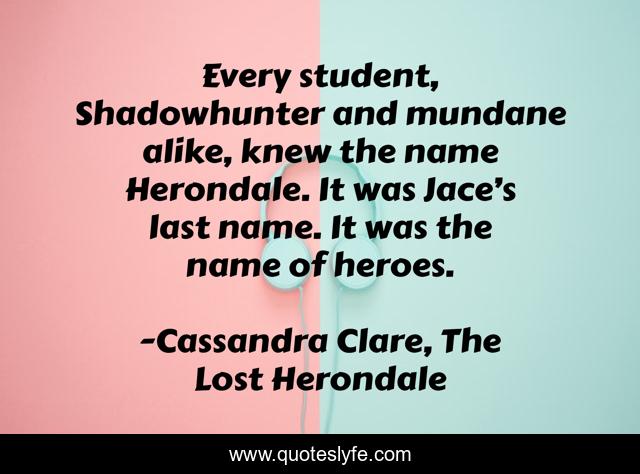 This page presents the quote "Every student, Shadowhunter and mundane alike, knew the name Herondale. It was Jace’s last name. It was the name of heroes.". Author of this quote is Cassandra Clare, The Lost Herondale. This quote is about herondale, students, mundanes, william-herondale, shadowhunters, james-herondale, heroes, jace-herondale, herondales,.