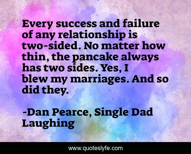 This page presents the quote "Every success and failure of any relationship is two-sided. No matter how thin, the pancake always has two sides. Yes, I blew my marriages. And so did they.". Author of this quote is Dan Pearce, Single Dad Laughing. This quote is about relationships, divorce, marriage, responsibilityresponsibility,.