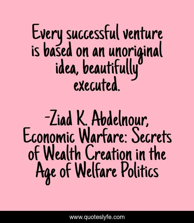 This page presents the quote "Every successful venture is based on an unoriginal idea, beautifully executed.". Author of this quote is Ziad K. Abdelnour, Economic Warfare: Secrets of Wealth Creation in the Age of Welfare Politics. This quote is about successful, execution, idea, venture,.