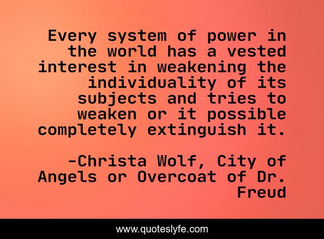 This page presents the quote "Every system of power in the world has a vested interest in weakening the individuality of its subjects and tries to weaken or it possible completely extinguish it.". Author of this quote is Christa Wolf, City of Angels or Overcoat of Dr. Freud. This quote is about individuality, power,.
