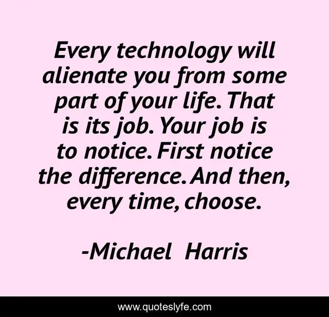 This page presents the quote "Every technology will alienate you from some part of your life. That is its job. Your job is to notice. First notice the difference. And then, every time, choose.". Author of this quote is Michael Harris. This quote is about job, technology, modern-life,.