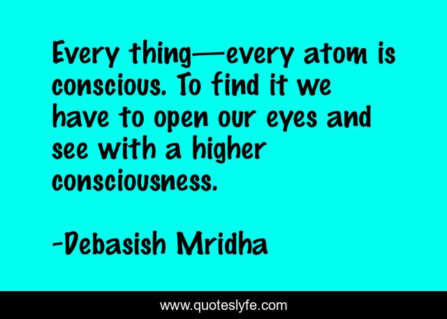 This page presents the quote "Every thing—every atom is conscious. To find it we have to open our eyes and see with a higher consciousness.". Author of this quote is Debasish Mridha. This quote is about consciousness, higher-level-of-consciousness, philosophy, debasish-mridha, quotes, inspirational, enthusiasm, every-atom-is-conscious, debasish-mridha-m-d,.