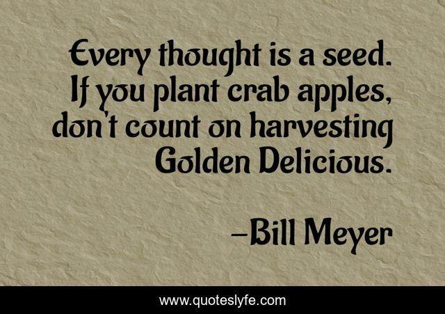 This page presents the quote "Every thought is a seed. If you plant crab apples, don't count on harvesting Golden Delicious.". Author of this quote is Bill Meyer. This quote is about quotes, apple, apples, quotes-to-live-by,.