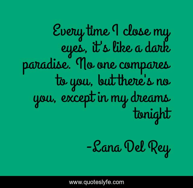 This page presents the quote "Every time I close my eyes, it's like a dark paradise. No one compares to you, but there's no you, except in my dreams tonight". Author of this quote is Lana Del Rey. This quote is about love, dreams, affection,.