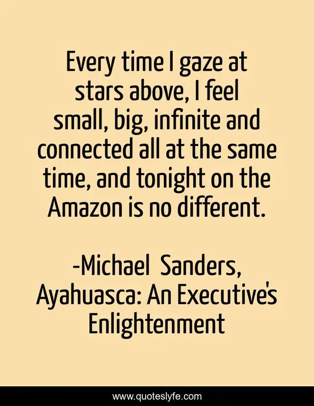 This page presents the quote "Every time I gaze at stars above, I feel small, big, infinite and connected all at the same time, and tonight on the Amazon is no different.". Author of this quote is Michael Sanders, Ayahuasca: An Executive's Enlightenment. This quote is about life, ayahuasca, infinity, stargazing, spirituality, potential, stars, love, cosmos,.