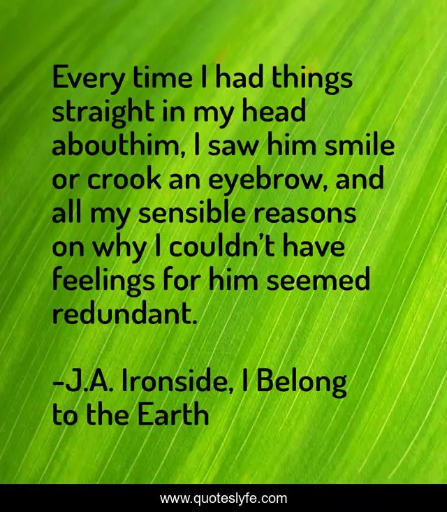 This page presents the quote "Every time I had things straight in my head abouthim, I saw him smile or crook an eyebrow, and all my sensible reasons on why I couldn’t have feelings for him seemed redundant.". Author of this quote is J.A. Ironside, I Belong to the Earth. This quote is about mystery, possession, paranormal-thriller, ya, fiction, romance, fantasy, supernatural, ghosts,.