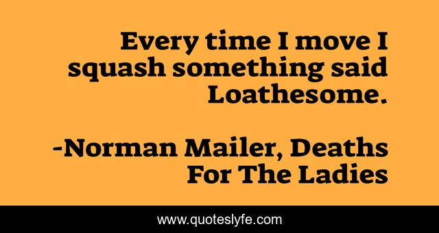 This page presents the quote "Every time I move I squash something said Loathesome.". Author of this quote is Norman Mailer, Deaths For The Ladies. This quote is about loathesome, self-deprecation, self-esteem,.