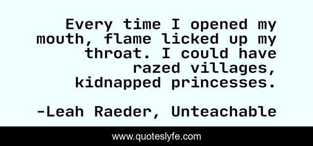 This page presents the quote "Every time I opened my mouth, flame licked up my throat. I could have razed villages, kidnapped princesses.". Author of this quote is Leah Raeder, Unteachable. This quote is about desire, energy, flame,.