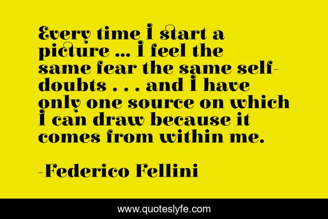 This page presents the quote "Every time I start a picture ... I feel the same fear the same self-doubts . . . and I have only one source on which I can draw because it comes from within me.". Author of this quote is Federico Fellini. This quote is about ways, fear, overcome,.