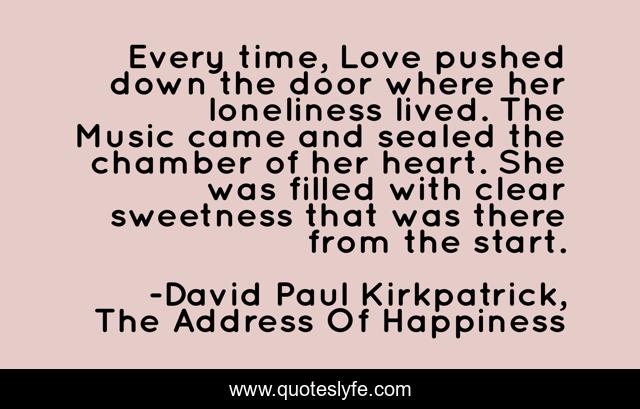 This page presents the quote "Every time, Love pushed down the door where her loneliness lived. The Music came and sealed the chamber of her heart. She was filled with clear sweetness that was there from the start.". Author of this quote is David Paul Kirkpatrick, The Address Of Happiness. This quote is about loneliness, love, affection, holy-spirit,.
