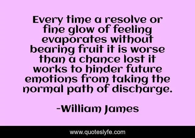 This page presents the quote "Every time a resolve or fine glow of feeling evaporates without bearing fruit it is worse than a chance lost it works to hinder future emotions from taking the normal path of discharge.". Author of this quote is William James. .