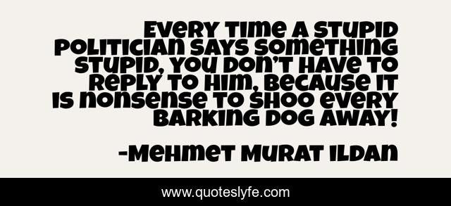 This page presents the quote "Every time a stupid politician says something stupid, you don’t have to reply to him, because it is nonsense to shoo every barking dog away!". Author of this quote is Mehmet Murat ildan. This quote is about dogs, politician, barking, ildan-wise-sayings, turkish, ildan-wisdom, bad-politicians, turkish-playwrights, dog,.