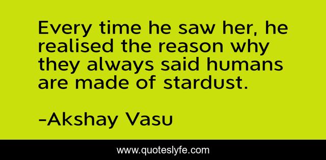This page presents the quote "Every time he saw her, he realised the reason why they always said humans are made of stardust.". Author of this quote is Akshay Vasu. This quote is about everytime, always, humans, reason, stardust, she, realise, special, he,.