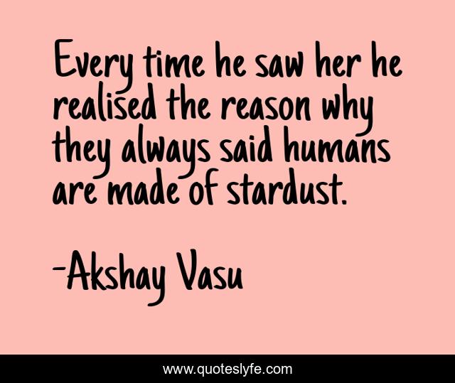 This page presents the quote "Every time he saw her he realised the reason why they always said humans are made of stardust.". Author of this quote is Akshay Vasu. This quote is about star, always, humans, stardust, she, realize,.