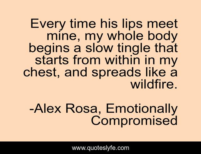 This page presents the quote "Every time his lips meet mine, my whole body begins a slow tingle that starts from within in my chest, and spreads like a wildfire.". Author of this quote is Alex Rosa, Emotionally Compromised. This quote is about wildfire, love, tingle, passion, kiss, affection,.