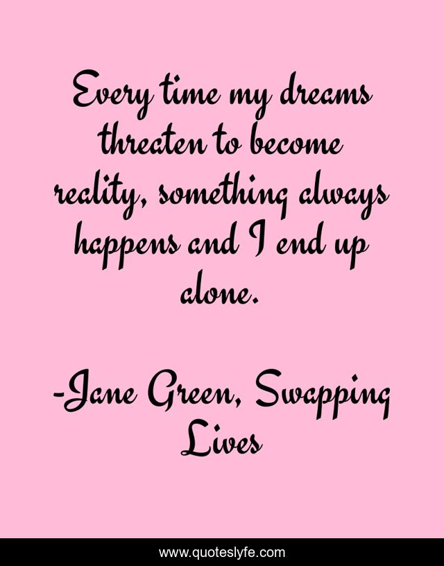 This page presents the quote "Every time my dreams threaten to become reality, something always happens and I end up alone.". Author of this quote is Jane Green, Swapping Lives. This quote is about alone, dissapointment, dreams,.