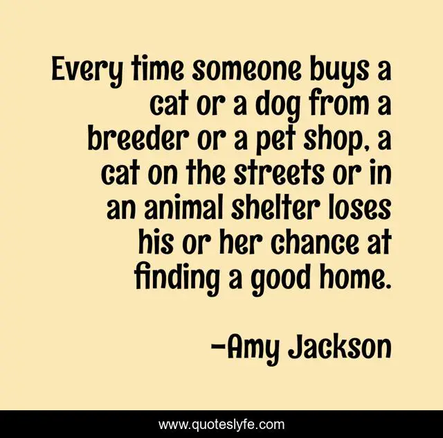 This page presents the quote "Every time someone buys a cat or a dog from a breeder or a pet shop, a cat on the streets or in an animal shelter loses his or her chance at finding a good home.". Author of this quote is Amy Jackson. This quote is about home, good, time,.