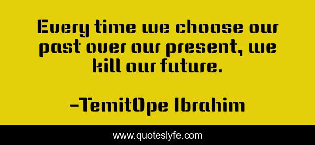 This page presents the quote "Every time we choose our past over our present, we kill our future.". Author of this quote is TemitOpe Ibrahim. This quote is about living, life, wise, encouarging, inspre-me, encouragement, choice, past, encourage,.
