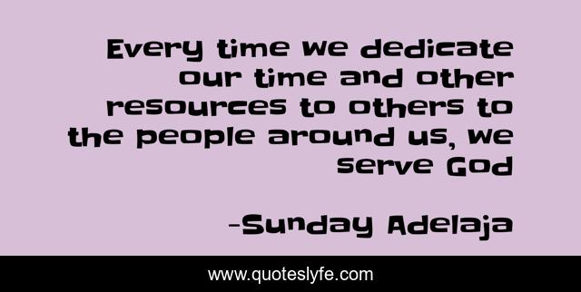 This page presents the quote "Every time we dedicate our time and other resources to others to the people around us, we serve God". Author of this quote is Sunday Adelaja. This quote is about kingdom, loving-others, life, love, destiny, serving-god, people, money, god,.