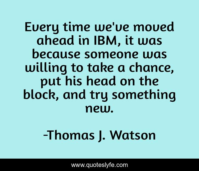 This page presents the quote "Every time we've moved ahead in IBM, it was because someone was willing to take a chance, put his head on the block, and try something new.". Author of this quote is Thomas J. Watson. This quote is about try, take a chance, time,.