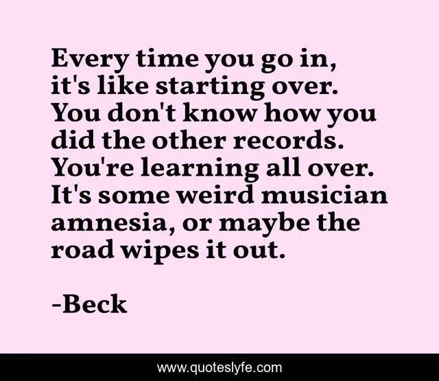 This page presents the quote "Every time you go in, it's like starting over. You don't know how you did the other records. You're learning all over. It's some weird musician amnesia, or maybe the road wipes it out.". Author of this quote is Beck. This quote is about history, music, amnesia, writing,.