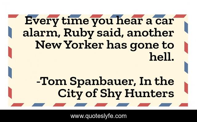 This page presents the quote "Every time you hear a car alarm, Ruby said, another New Yorker has gone to hell.". Author of this quote is Tom Spanbauer, In the City of Shy Hunters. .