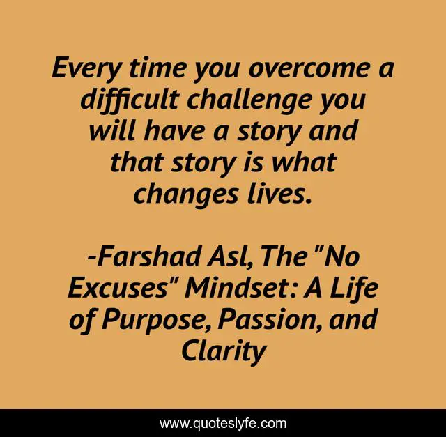 This page presents the quote "Every time you overcome a difficult challenge you will have a story and that story is what changes lives.". Author of this quote is Farshad Asl, The "No Excuses" Mindset: A Life of Purpose, Passion, and Clarity. This quote is about challenges, life, story, change,.