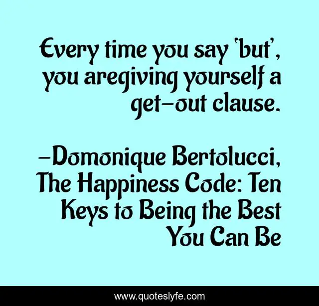 This page presents the quote "Every time you say ‘but’, you aregiving yourself a get-out clause.". Author of this quote is Domonique Bertolucci, The Happiness Code: Ten Keys to Being the Best You Can Be. This quote is about life-coaching, motivation, how-to-be-happier, life-coach, be-happy, how-to-be-happy, happiness-advice, happiness, be-more-motivated,.