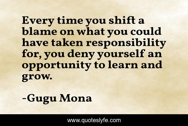 This page presents the quote "Every time you shift a blame on what you could have taken responsibility for, you deny yourself an opportunity to learn and grow.". Author of this quote is Gugu Mona. This quote is about deny, take-responsibility, shift-blame, learn, opportunity, grow,.
