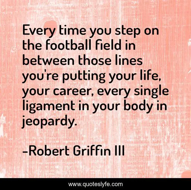 This page presents the quote "Every time you step on the football field in between those lines you're putting your life, your career, every single ligament in your body in jeopardy.". Author of this quote is Robert Griffin III. This quote is about life, football, step,.