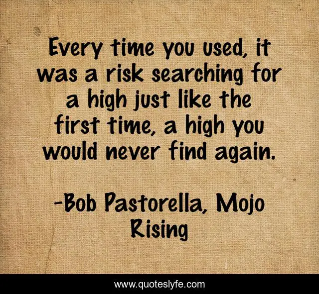 This page presents the quote "Every time you used, it was a risk searching for a high just like the first time, a high you would never find again.". Author of this quote is Bob Pastorella, Mojo Rising. This quote is about drugs, reality, sad,.