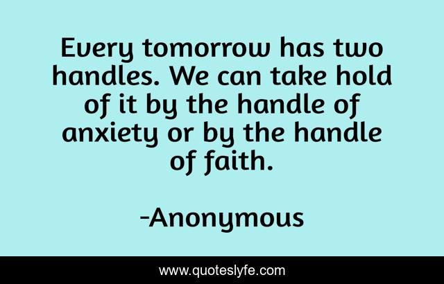 This page presents the quote "Every tomorrow has two handles. We can take hold of it by the handle of anxiety or by the handle of faith.". Author of this quote is Anonymous. This quote is about faith, unity,.