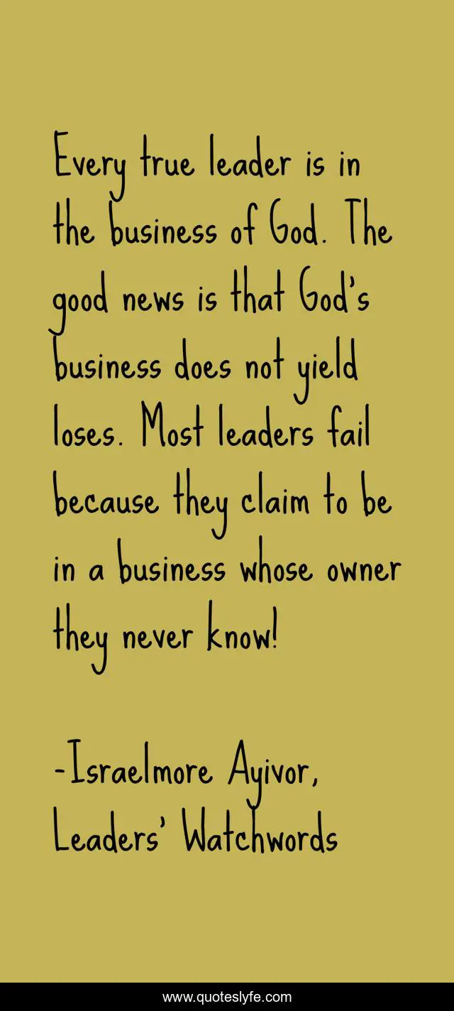 This page presents the quote "Every true leader is in the business of God. The good news is that God’s business does not yield loses. Most leaders fail because they claim to be in a business whose owner they never know!". Author of this quote is Israelmore Ayivor, Leaders' Watchwords. This quote is about jehovah, leaders, win, profit-and-loss, fail, owner, food-for-thought, lead, profit,.