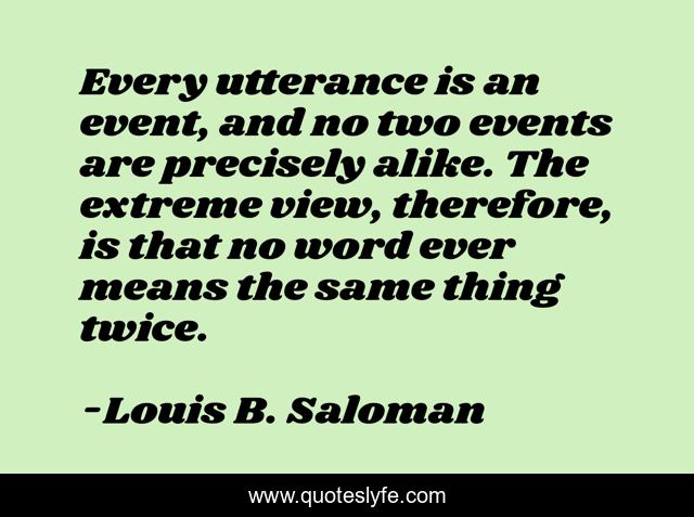 This page presents the quote "Every utterance is an event, and no two events are precisely alike. The extreme view, therefore, is that no word ever means the same thing twice.". Author of this quote is Louis B. Saloman. .
